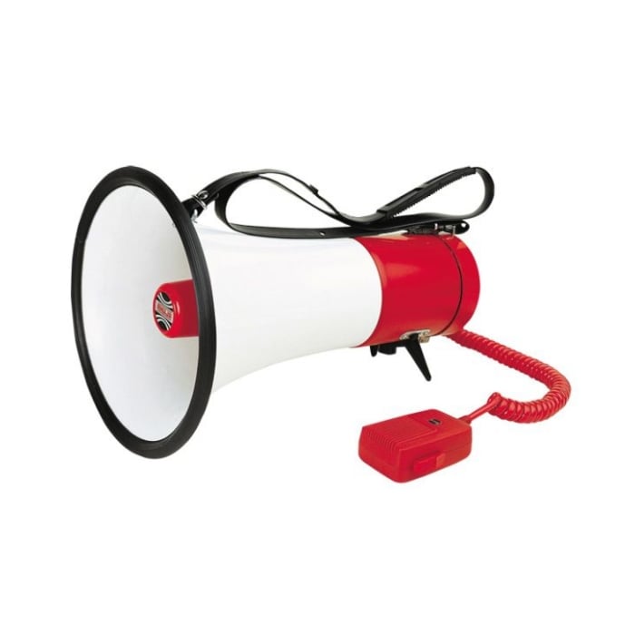 The AHUJA AM-21S Portable PA Megaphone is designed to provide clear sound with long-range and efficient performance. It can be powered with either a dry cell or a 12V car battery and features a Class-D amplifier for power efficiency and extended battery life of about 15 hours. It also has an all-ABS body that is both sturdy and lightweight, a built-in siren, a microphone with volume control, and a press-to-talk switch.