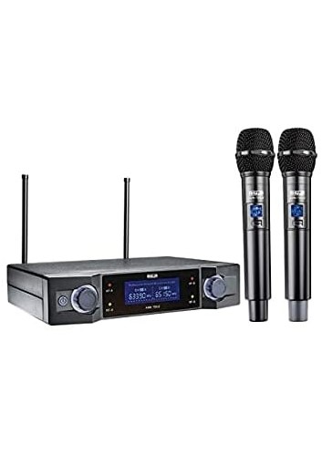 - Dual‑channel UHF wireless system with two handheld dynamic transmitters for simultaneous use.