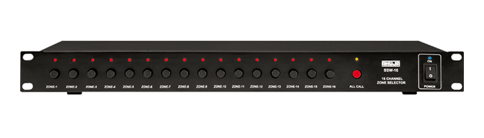 SSW-16M 16 Channel Zone Selector: Compact and reliable manual zone selector with provision for switching a 100V audio signal to one or more of up to 16 zones. 1 x 100V Input, 16 x 100V Outputs, Manually Switchable. When multiple units of SSW-16M are used, ALL CALL activation is possible from any one SSW-16M by using the LOOP THROUGH facility. Built-in relay for ALL CALL. LED indication of selected zones.
