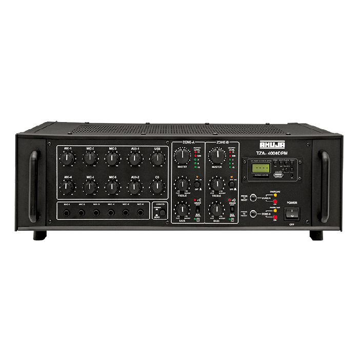 TZA-4000®DPM 400 WATTS WITH BUILT-IN DIGITAL PLAYER 2 ZONE PA MIXER AMPLIFIER AMPLIFIER 6 Mic, 2 Aux Inputs, and CD/Stereo input (L&R). Built-in MP3 player with remote control for USB and SD/MMC card reader. TZA-2000DP is ideal for medium-sized installations such as in places of worship where two separate groups of speakers need to be connected. The user has a choice to connect both the zones to 100V (LMT) type speakers or 100V speakers to one zone and low impedance type speakers to the other zone. Both the zones can also be connected to low-impedance-type speakers. Easy accessibility of DC fuses fitted on the rear panel. Instant transfer to DC power (car battery) if AC power fails.