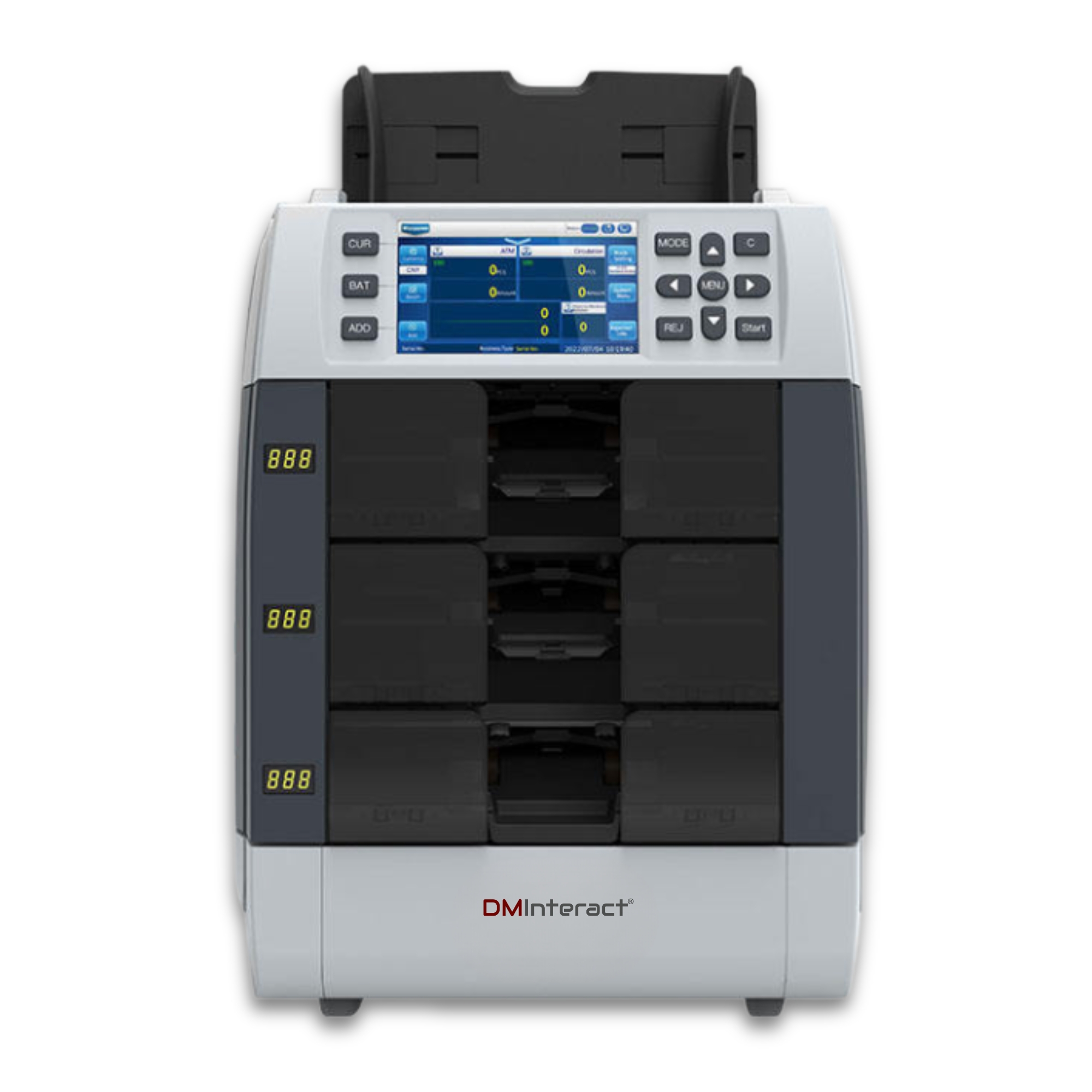 The DMInteract DM‑3000 is a high-performance money counting machine designed for efficiency, accuracy, and versatility. Featuring 3-pocket sorting, it quickly separates notes by denomination, while its high-speed counting capability of up to 1,000 notes per minute ensures fast operations even during peak hours. Supporting up to 65 currencies, this machine is ideal for multi-currency environments. An external display allows clear visibility for operators and customers alike, and advanced counterfeit detection provides reliable security with every transaction. Perfect for banks, retail outlets, and currency exchange centers, the DM‑3000 combines speed, precision, and functionality in one compact counting solution.