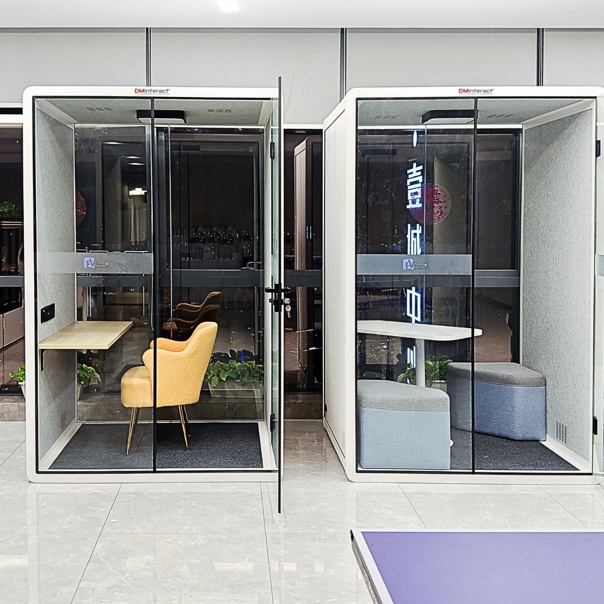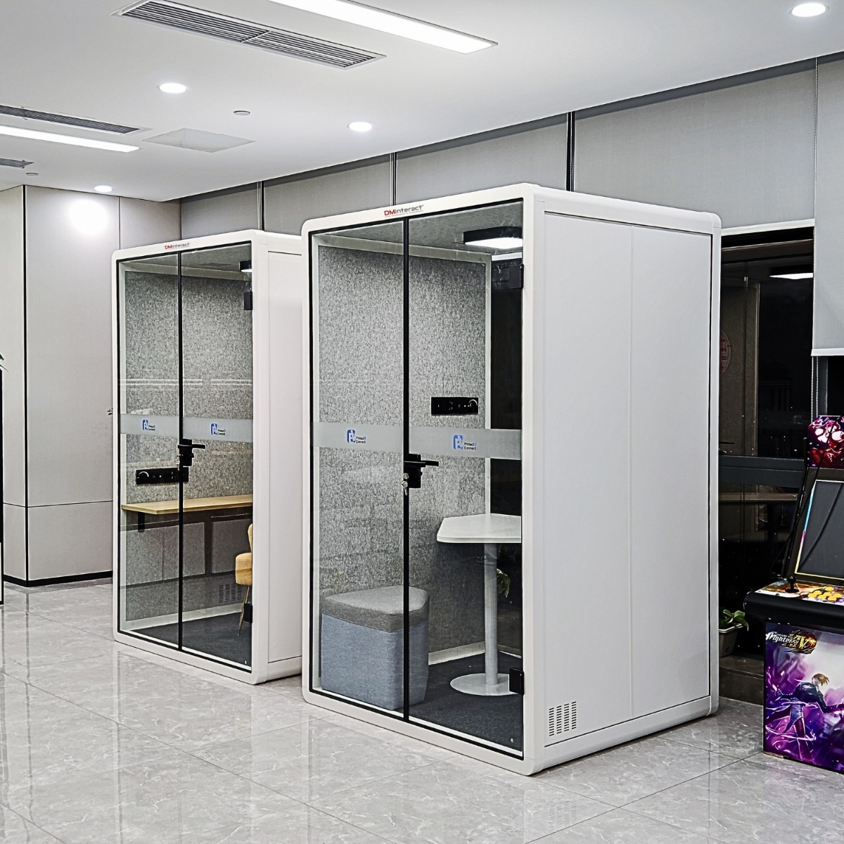 DM-DualPod includes universal power outlets and USB ports for seamless device connectivity. Smart control systems manage lighting and ventilation automatically, allowing users to work efficiently without interruptions. Whether in an office, co-working space, or home studio, the pod supports all modern work requirements.