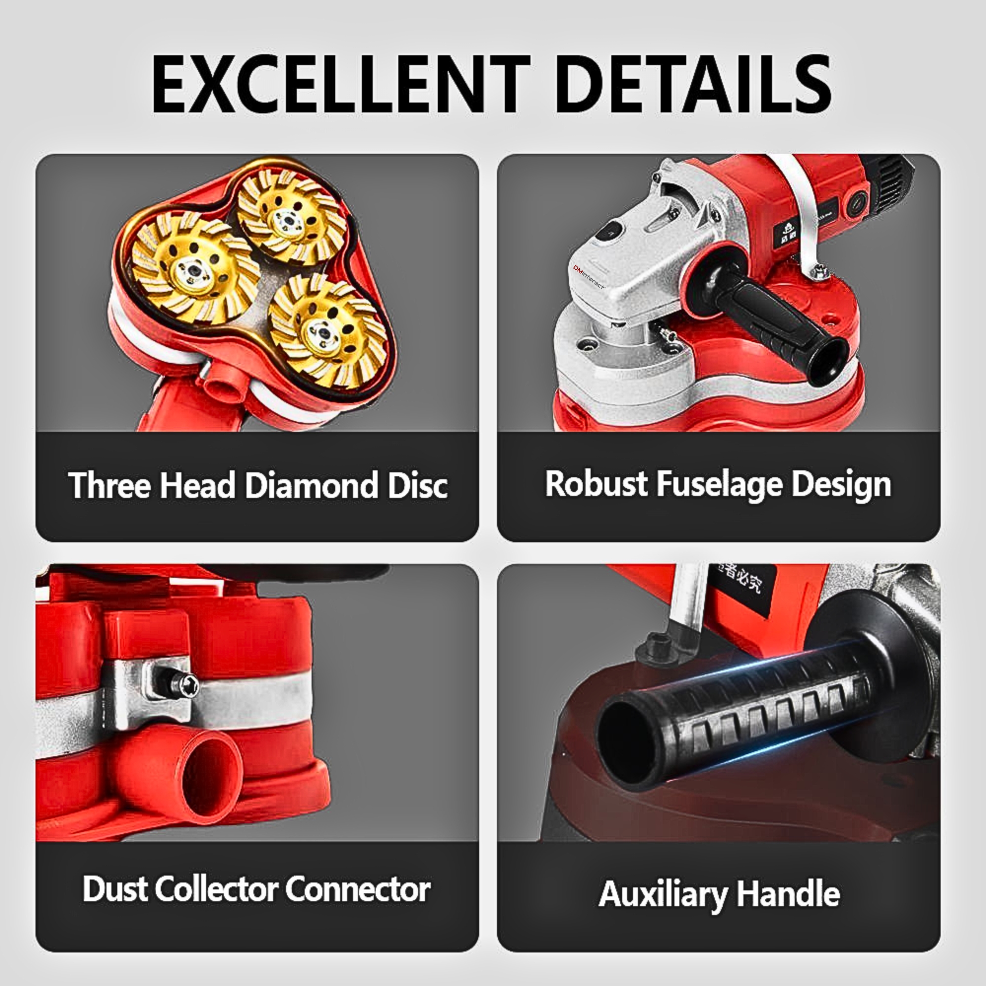 | Product Name | DMInteract DM-FGP310 5400RPM Semi-Automatic Concrete Polishing & Grinding Machine with 4 Types Discs & Dust Vacuum Cleaner |