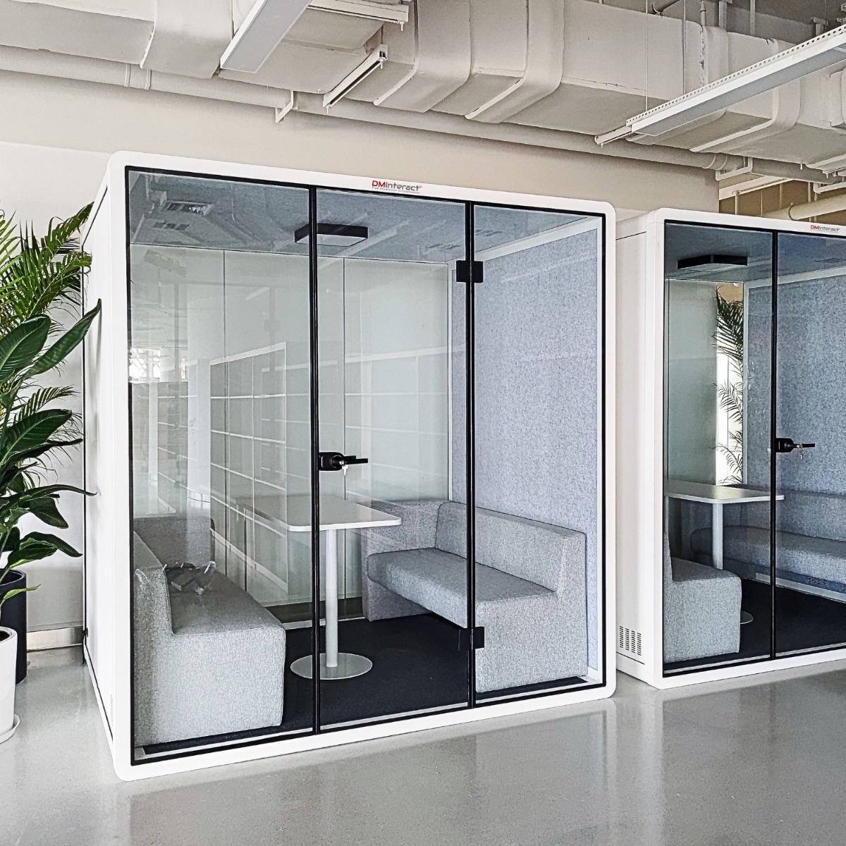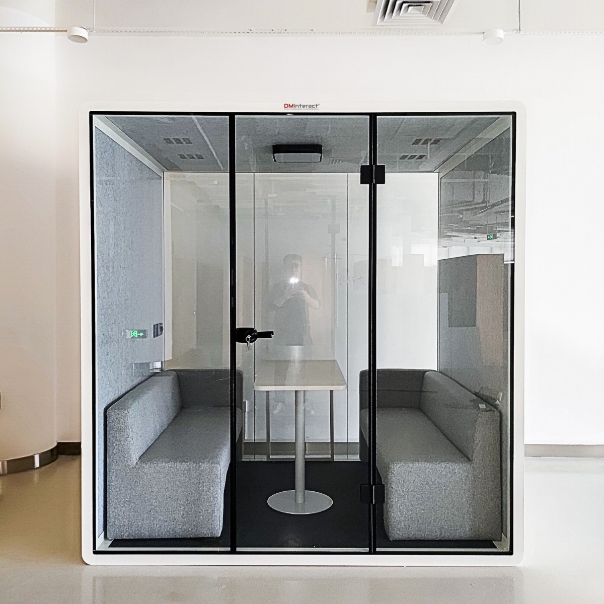 Constructed with PET acoustic panels, insulated composite boards, and aluminum framing, DM-QuadPod combines durability with modern aesthetics. The interior offers ergonomic seating for four, optional integrated tables, and flexible furnishings, allowing teams to customize layouts for meetings, discussions, or creative work.