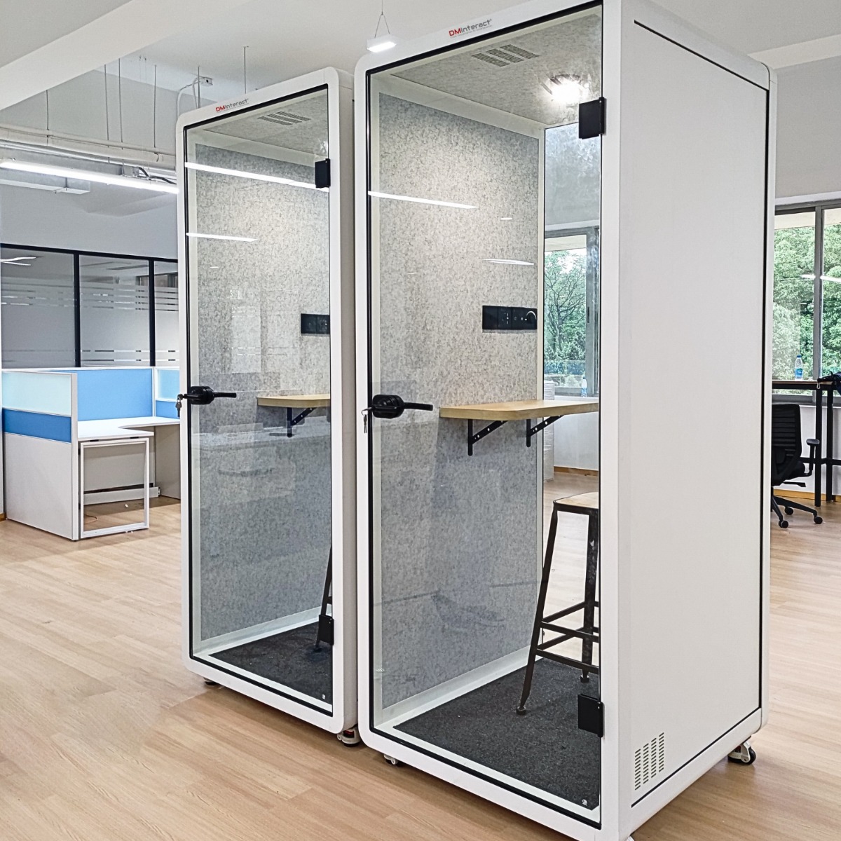 DMInteract Solo is a premium single-seater acoustic work pod designed to provide complete privacy, superior sound isolation, and a distraction-free environment. Ideal for focused tasks, video calls, professional meetings, and deep work, it combines smart ventilation, motion-sensor lighting, and modern materials to deliver a comfortable and efficient workspace.