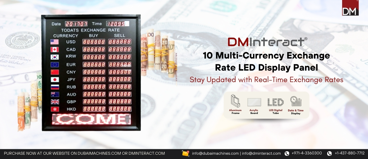 Dubai Machines provides a range of exchange rate display boards that are perfect for banks, currency exchange offices, and retail environments. These boards feature clear, bright displays that show real-time exchange rates, ensuring your customers have the most up-to-date information. With user-friendly interfaces, customizable settings, and durable construction, these display boards are designed to withstand everyday use while providing reliable performance.