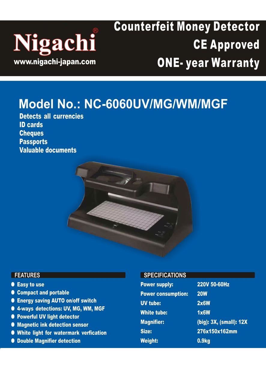 | Product Name | Nigachi NC-6060 UV/MG/WM/MGF Counterfeit Money Detector |