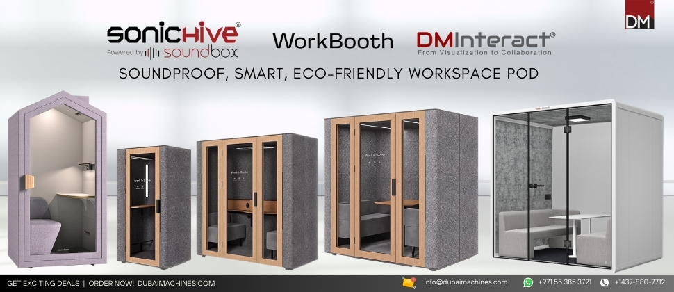 Upgrade your workspace with premium pods from leading brands. WorkBooth pods offer a compact, soundproof, and eco-friendly environment with smart management features, electronic multiport, and fresh air ventilation for maximum productivity. SonicHive & DMInteract pods combine innovative design and advanced technology to deliver comfort, style, and functionality, making them ideal for focused work or meetings. Explore both brands with worldwide shipping available, only at DubaiMachines.com.
