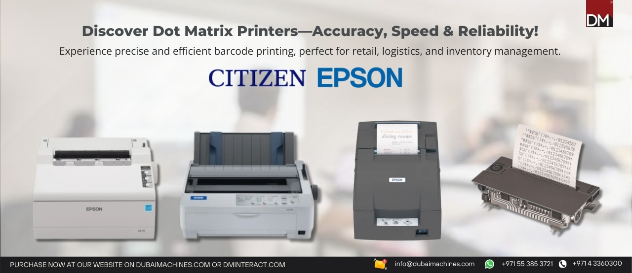 Looking for reliable Dot Matrix Printers? DubaiMachines.com offers a premium selection from leading brands like Epson, OKI, and Panasonic. Built for durability, high-speed performance, and consistent print quality, these printers are perfect for invoicing, multi-part forms, and continuous paper applications. Enjoy efficient, professional printing while benefiting from convenient doorstep delivery across the UAE and worldwide.