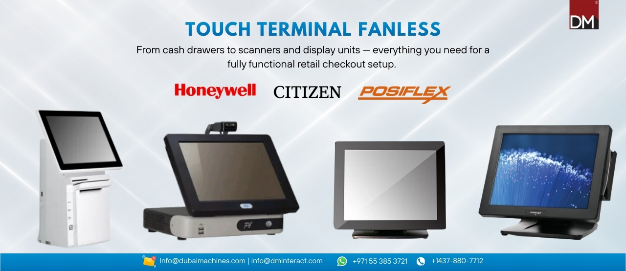 Enhance your retail or hospitality operations with Touch Terminal Fanless POS Systems from DubaiMachines.com. Featuring a sleek, compact design without noisy fans, these terminals provide reliable, silent, and energy-efficient performance. Perfect for restaurants, cafes, retail outlets, and service counters, they offer responsive touchscreens, durable construction, and seamless integration with your POS software — all with doorstep delivery across the UAE and worldwide.