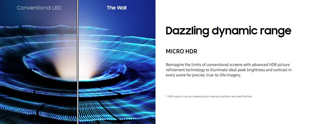 The Wall All‑in‑One supports sophisticated HDR technologies, including HDR10+ and LED HDR, broadening its peak brightness and contrast capabilities for more dynamic visuals. Coupled with MICRO Motion, the display can take standard 60 Hz video inputs and internally optimise motion performance, resulting in smoother on‑screen movement for fast‑paced video content.