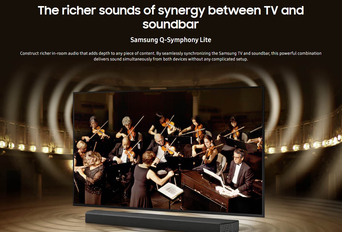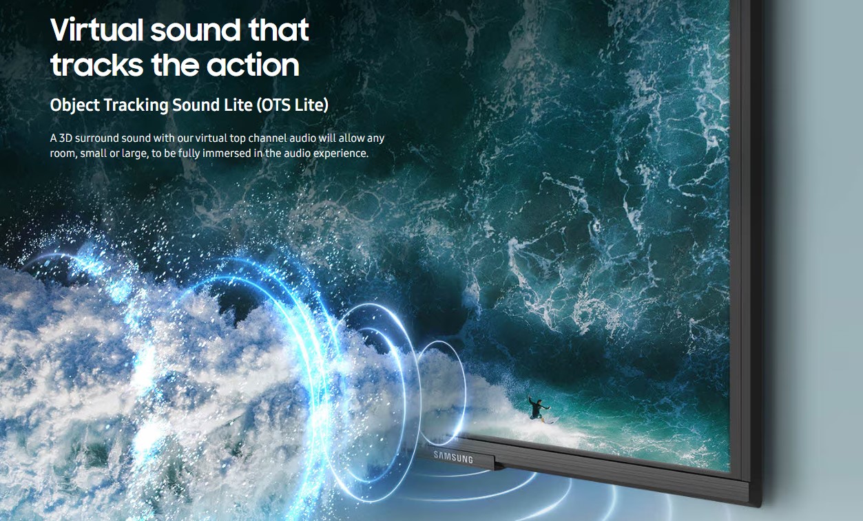 The television incorporates Object Tracking Sound Lite technology, which creates a more immersive audio effect by aligning sound with on-screen movement. Adaptive Sound optimizes audio output based on content type, ensuring clear dialogue and balanced sound levels. When paired with compatible sound systems, Q-Symphony Lite enhances overall audio depth for a richer entertainment experience.
