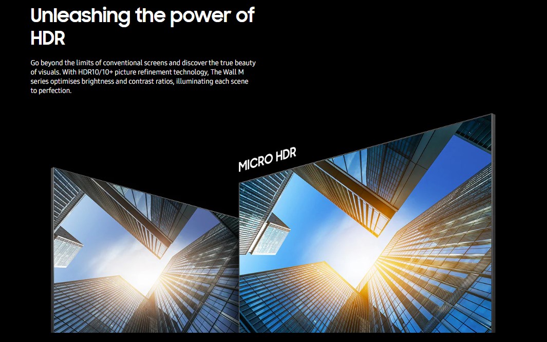 The Wall M uses Flip‑chip RGB LED technology for its pixel elements. This configuration ensures uniform light output and consistent color reproduction across the entire display, enhancing image fidelity and brightness stability compared to older LED implementations.