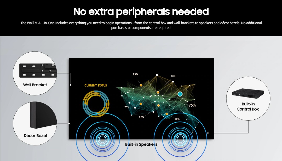 The Wall M All-in-One integrates built-in speakers along with comprehensive connectivity options such as HDMI, USB, RS‑232 and LAN. These features allow seamless content input and basic audio output capabilities without requiring external systems, making deployment faster and more self‑contained.