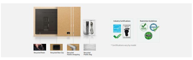 Samsung utilizes recycled plastics for the rear side cover and packaging of the QM32B-T. They've also achieved certifications for energy savings and carbon footprint reduction. The display also complies with guidelines for hazardous substances, such as RoHS, REACH, and WEEE.