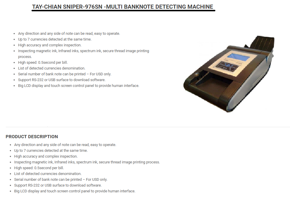 | Product Name | Tay-Chian Sniper 976SN Fake Currency Detector |