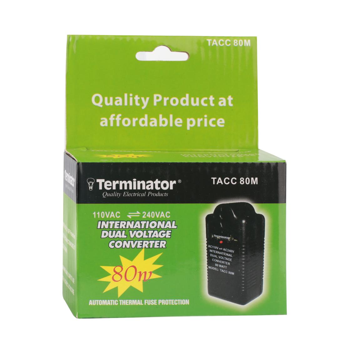 The Terminator 80W AC-AC Voltage Converter (Model TACC 80W) is a compact and reliable solution for powering low-wattage international appliances across different voltage standards. Designed for dual-voltage conversion, it allows users to safely convert electricity from 110V/120V to 220V/240V (step-up) and 220V/240V to 110V/120V (step-down).