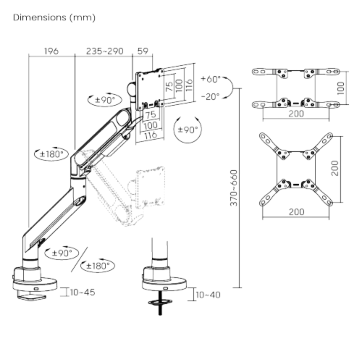 Installation is straightforward and versatile, thanks to its detachable VESA plate and compatibility with multiple VESA patterns (75×75, 100×100, 100×200, 200×100, 200×200). Whether mounted from above the desk or adapted to different setups, this monitor arm combines heavy-duty performance with flexibility, making it ideal for professional workstations and multi-monitor configurations.