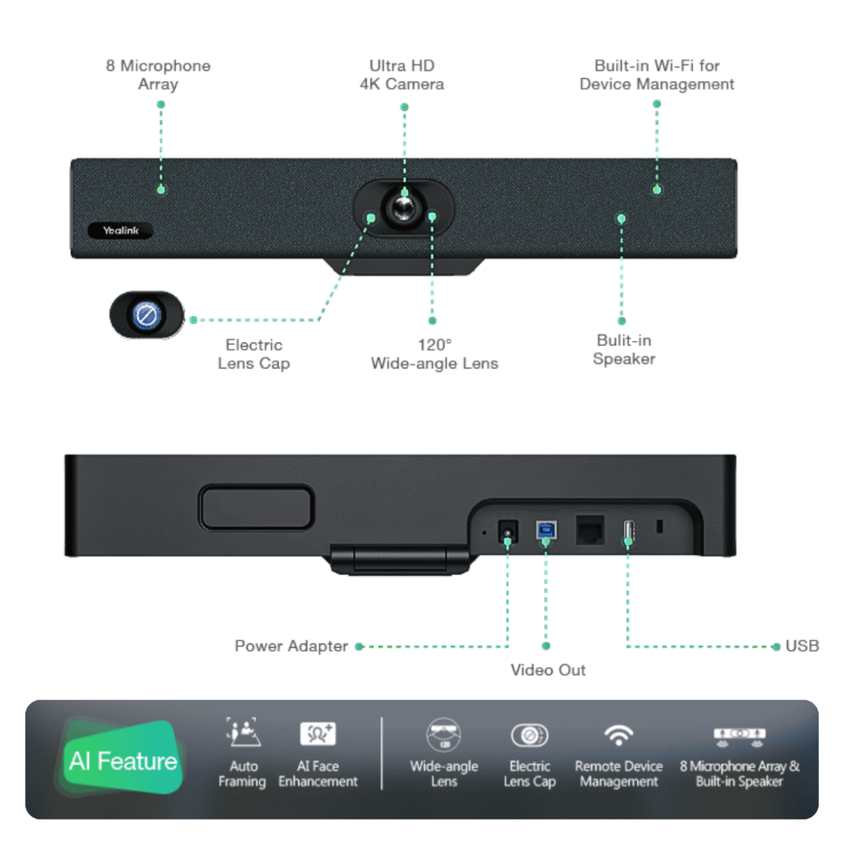 Product Name | Yealink UVC34 All-in-One USB Video Bar with 8-MIC Array, 5W Hi-Fi Speaker & AI-Powered PTZ Camera |
